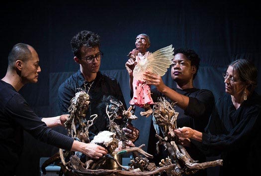 The emotional heart of the piece is fired by compassion for the death of so many young African Americans at the hand of civil power. A robust cohort of collaborators, horizontally arrayed, present a full-length puppet-play that inverts a convention, putting a grandmother’s wandering, transformation and adventures at the center (rather than leaving her in the parentheses).